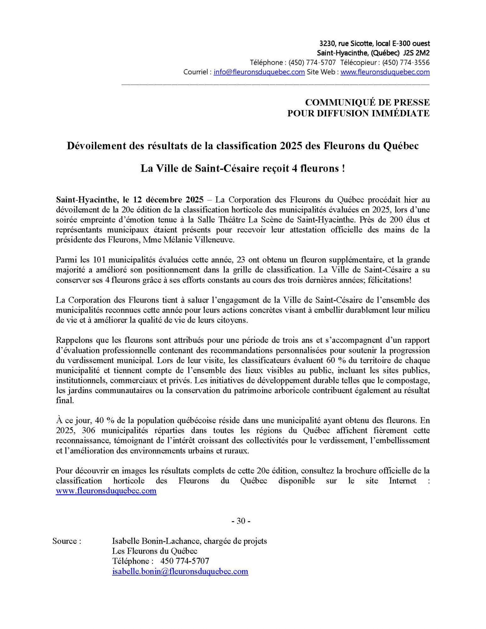⇒ 12 décembre 2025 – Communiqué des Fleurons du Québec