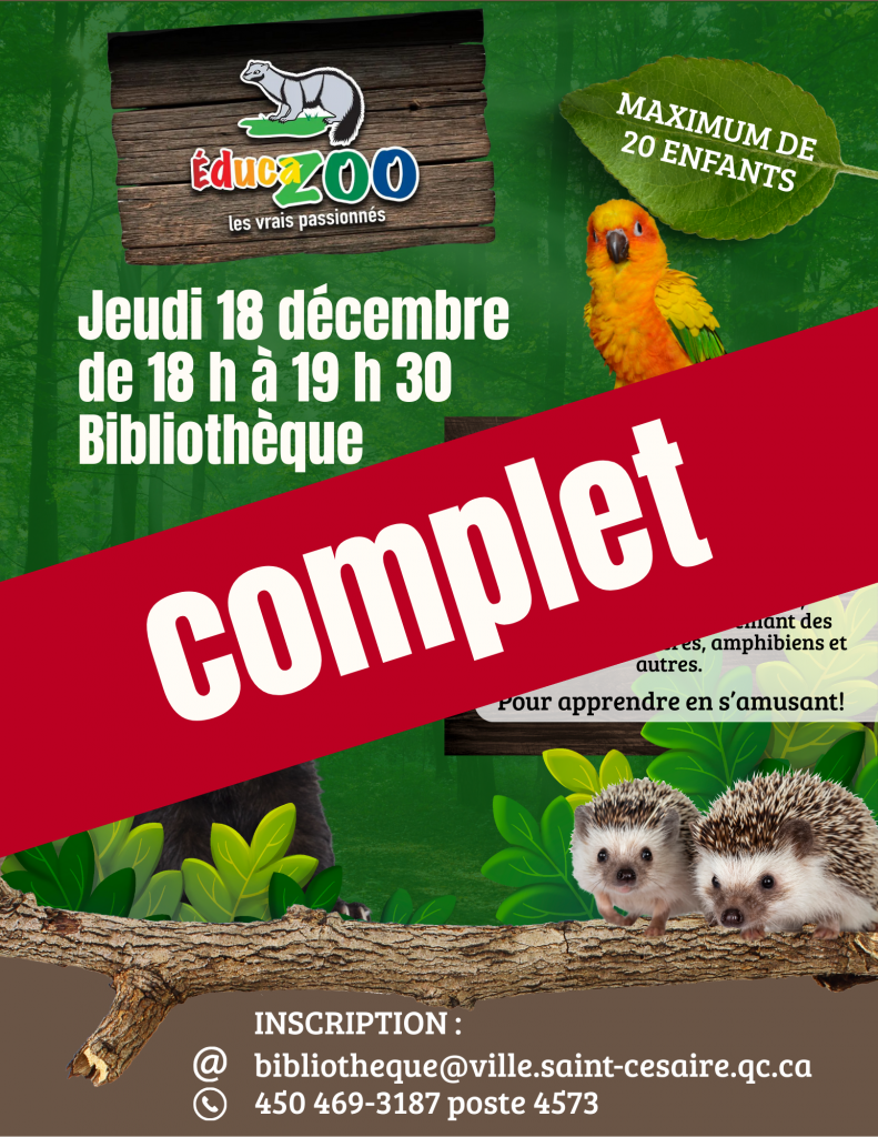 Vous désirez faire partie du Club ou souhaitez avoir plus d’informations? Communiquez avec nous par téléphone au 450 469-3187 poste 4573 ou par courriel à bibliotheque@ville.saint-cesaire.qc.ca.