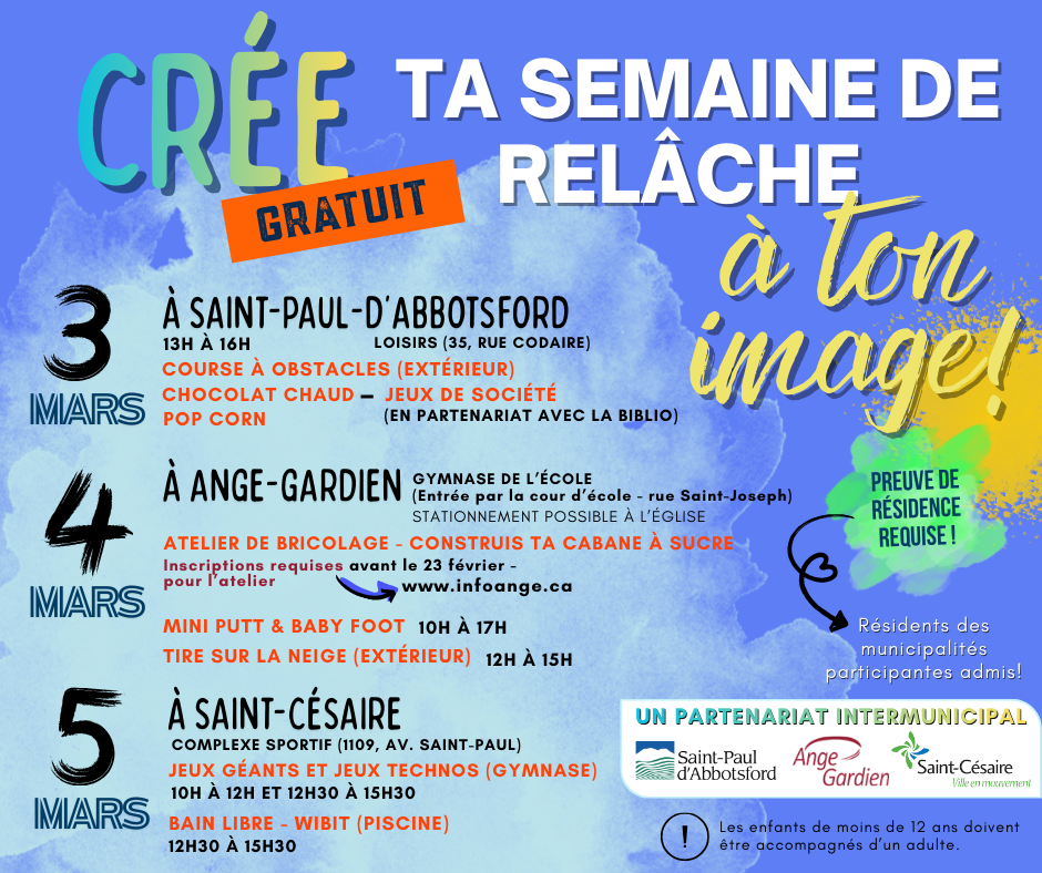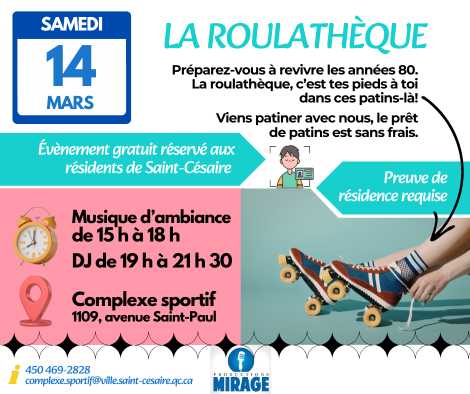 Informations générales: 450 469-2828 poste 321 ou complexe.sportif@ville.saint-cesaire.qc.ca