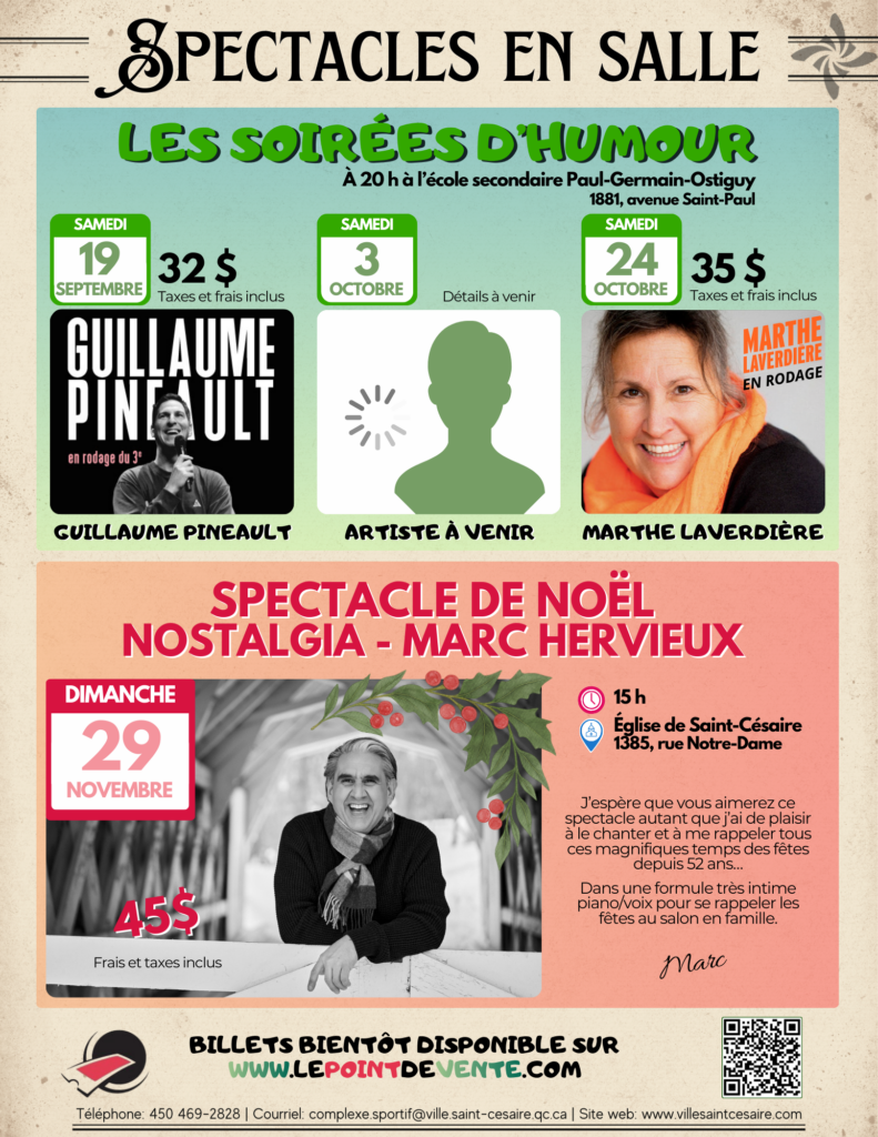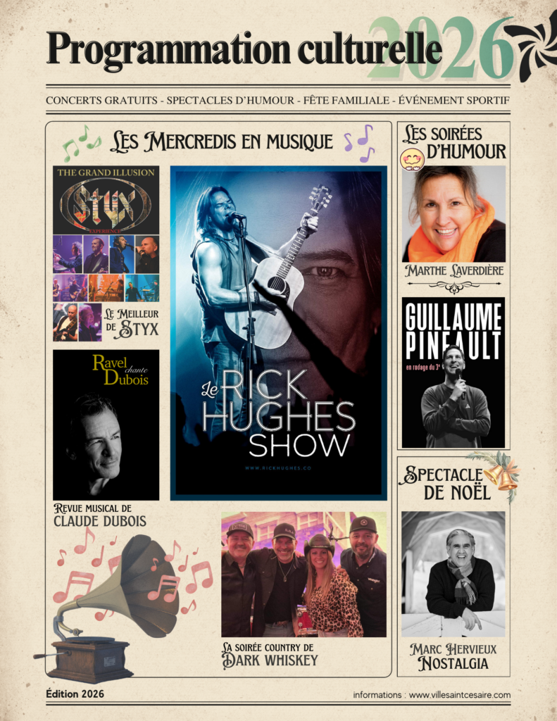 Vous désirez nous soumettre votre offre de spectacle? Envoyez la à Benjy Martin, coordonnateur aux événements culturels, sportifs et communautaires à benjy.martin@ville.saint-cesaire.qc.ca .