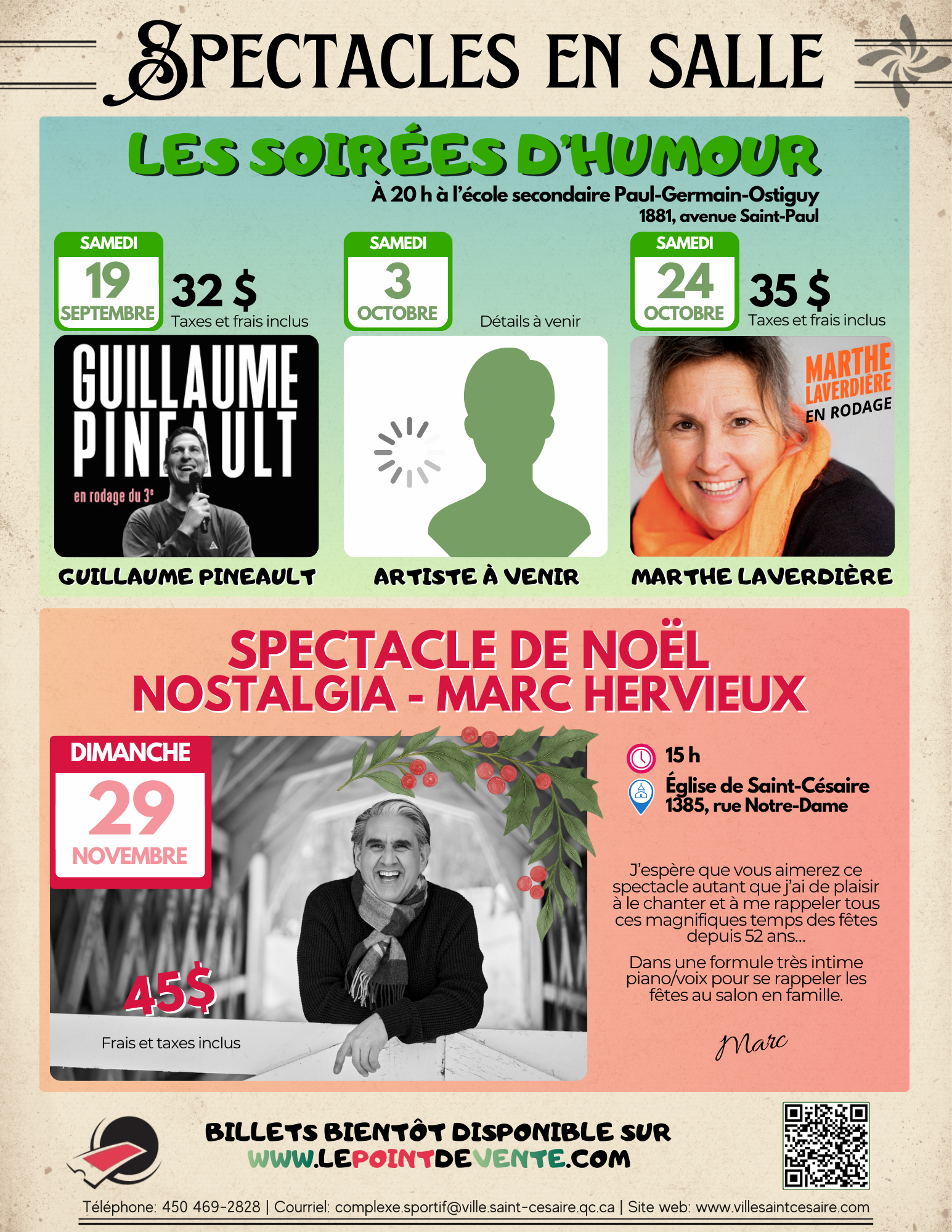 La vente de billets pour les spectacles de Guillaume Pineault, Marthe Laverdière et Marc Hervieux débute le 24 février dès midi.