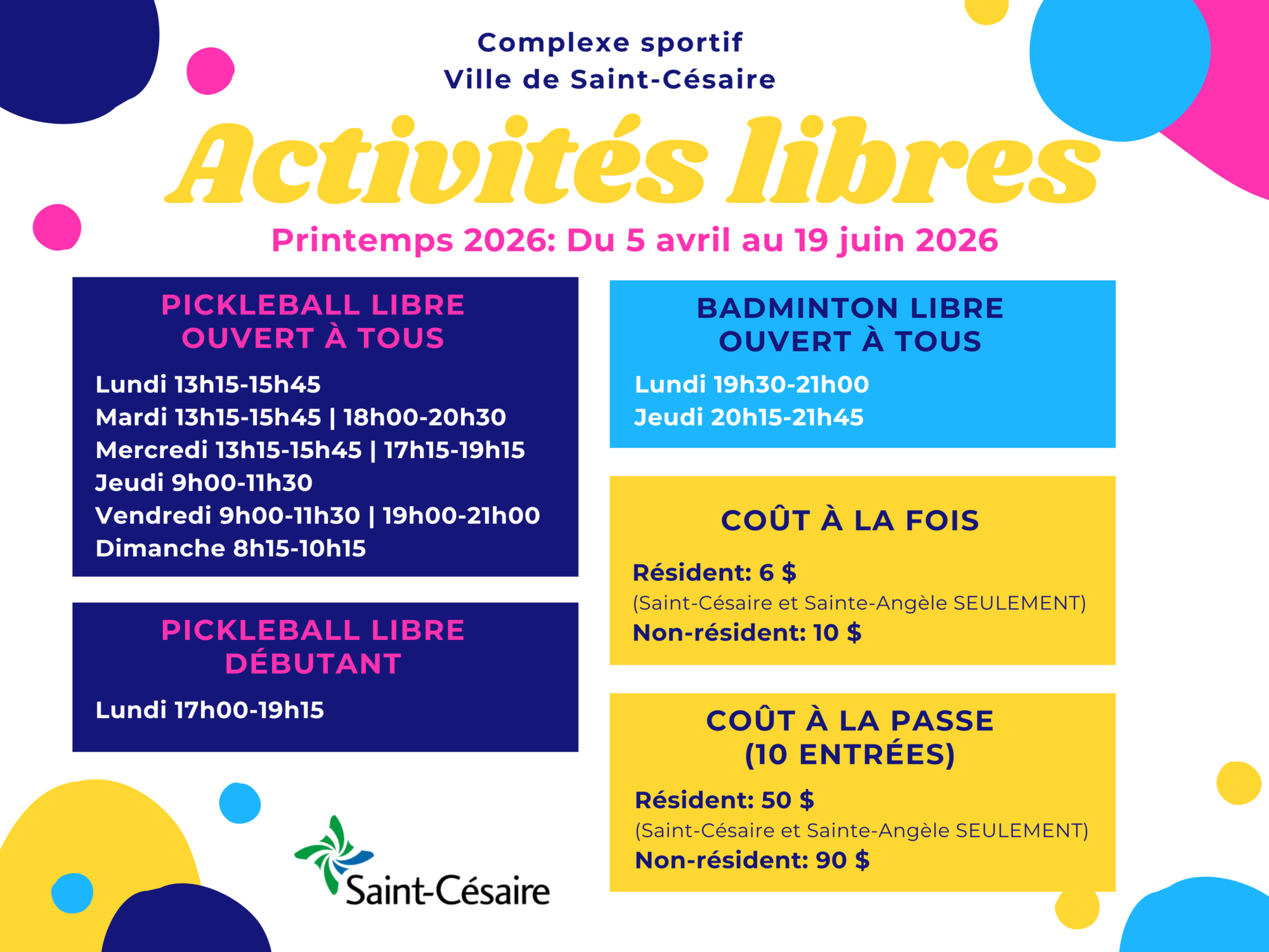 Horaire – Printemps 2026 (5 avril au 19 juin)