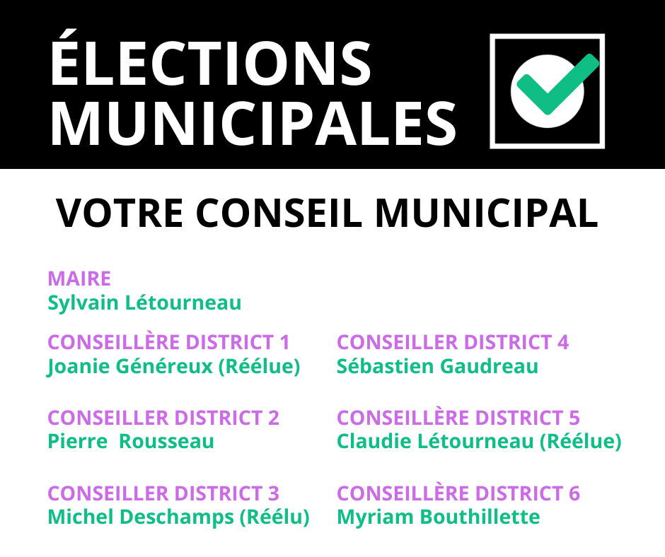 RÉSULTATS DES ÉLECTIONS MUNICIPALES CLIQUEZ ICI : www.electionsquebec.qc.ca/resultats