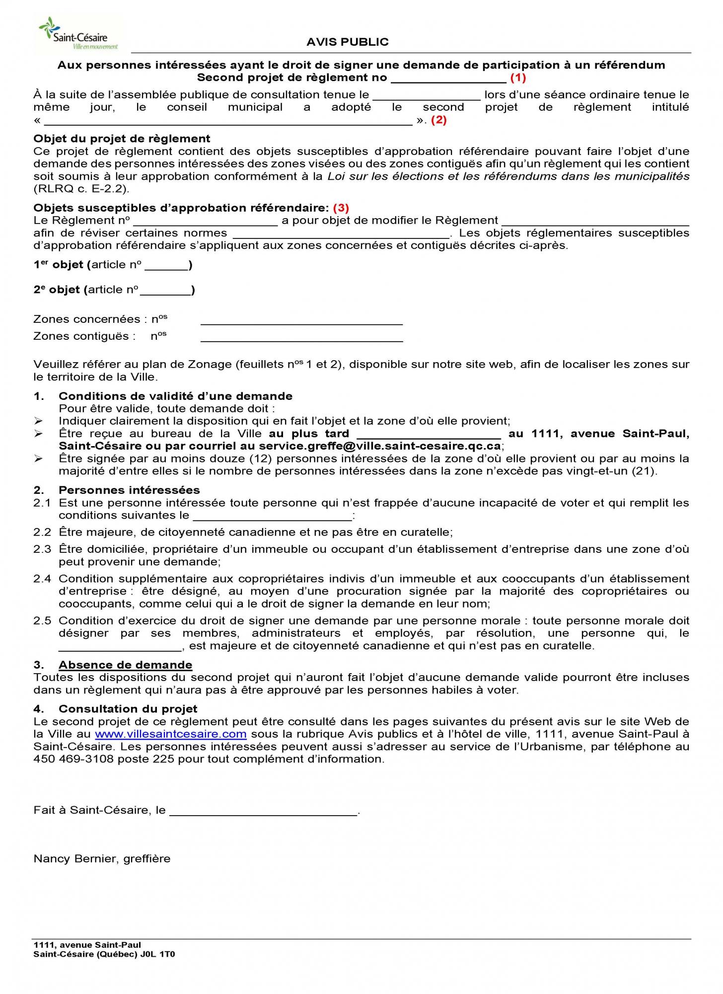 Avis public annonçant la possibilité de faire une demande de participation à un référendum.