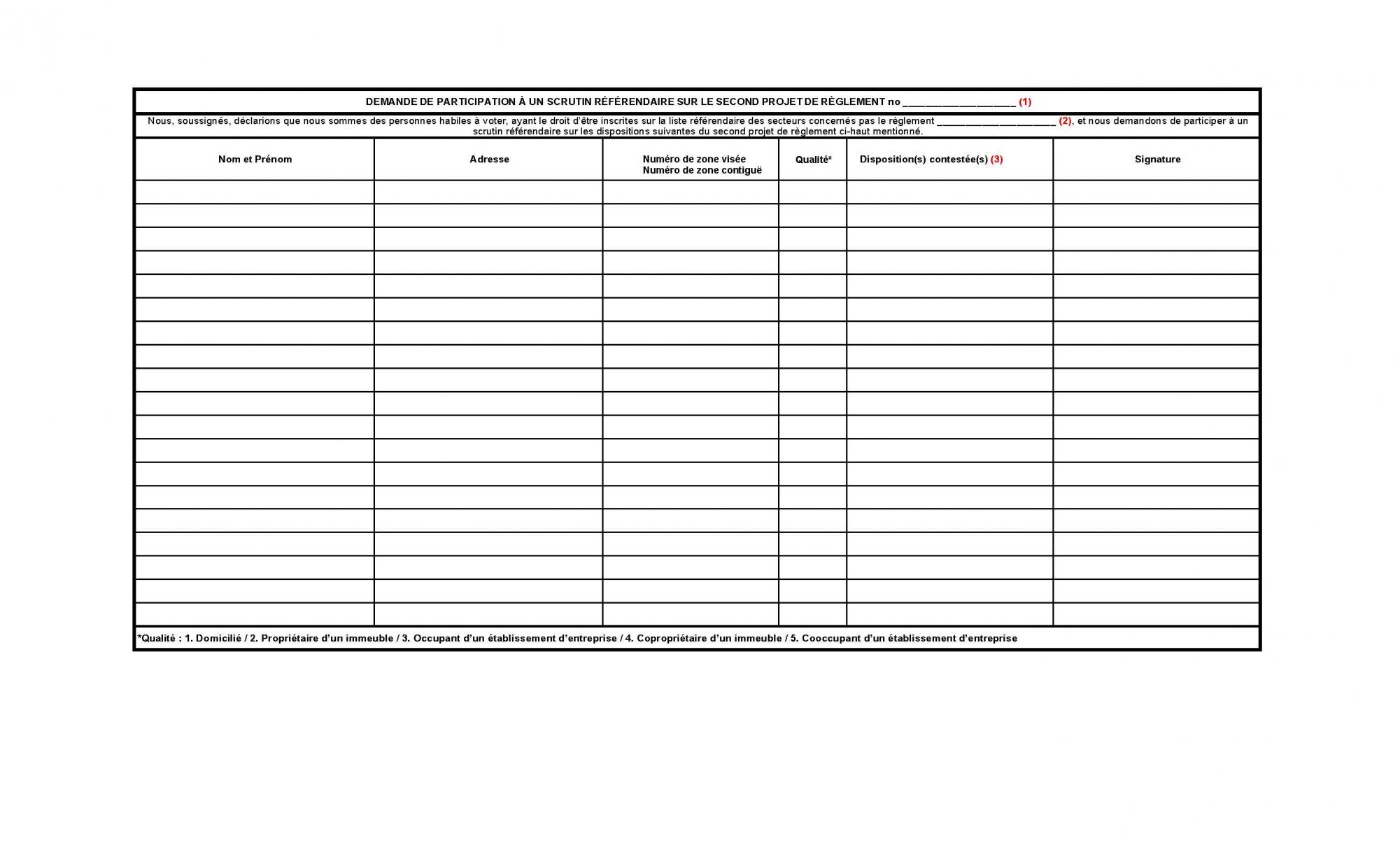 Pour être valide, toute demande devra indiquer les dispositions du prjet de règlement qui font l’objet de la demande, être signée par 12 personnes habitant la zone si celle-ci contient plus de 21 personnes ou par la majorité des personnes de la zone si elle contient 21 personnes ou moins.